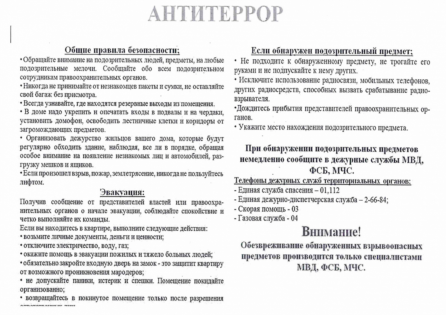 - Обратите особое внимание на появление неизвестных лиц в вашем дворе или подъезде, оставленные без присмотра вещи, а также любые необычные события.